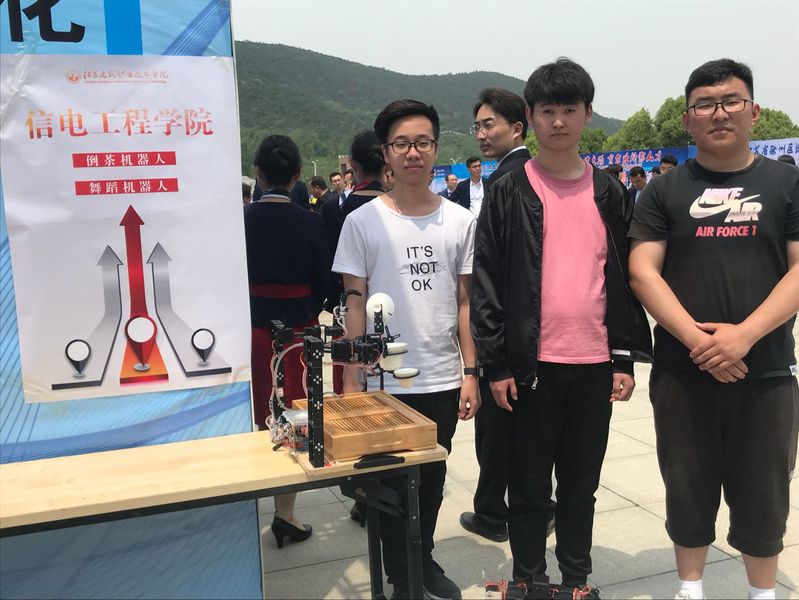 5月9日上午,2019年江苏省暨徐州市职业教育活动周启动仪式在我校隆重举行。我院展示了由杨博顺、王登科、纪思文三位同学制作的舞蹈机器人和倒茶机器人。舞蹈机器人需要跟好音乐的节奏,一帧一帧的调动作,然后把程序存好下载到主控器上,机器人在跳动作的时候,需要特别注意机器人的平衡,以及电机的受力,整个过程最难得是舞蹈动作的编排。倒茶机器人其特征在于在茶座上面放置由有活节的机械手组成的机器人体的机器人支架的内部,安装有用来驱动和控制由所述机器人体所握持的工具的操作的电路,整个控制的难点主要集中在机器手臂摆动的角度、幅度和力度要恰到好处。