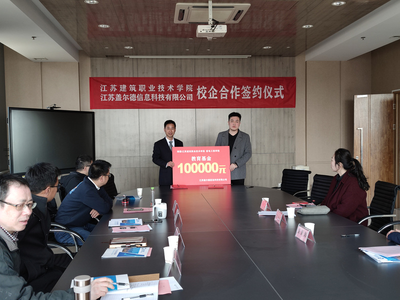 签约仪式上,王泳辰总经理介绍了公司的历史、现状以及将来发展目标,也感谢我校往届毕业生给公司创造的价值,并把我校作为公司第一家的合作高校。娄志刚处长介绍我校的办学历史、办学特色以及校企合作政策。信电工程学院院长吴兆立向王泳辰一行介绍了学院的办学规模、专任教师和专业发展等基本情况。双方针对现代学徒制人才培养模式、人才培养方案开发实施和信息技术应用等方面进行了详细交流与深入探讨。同时,江苏盖尔德信息科技有限公司向我校捐助教育基金人民币十万元。