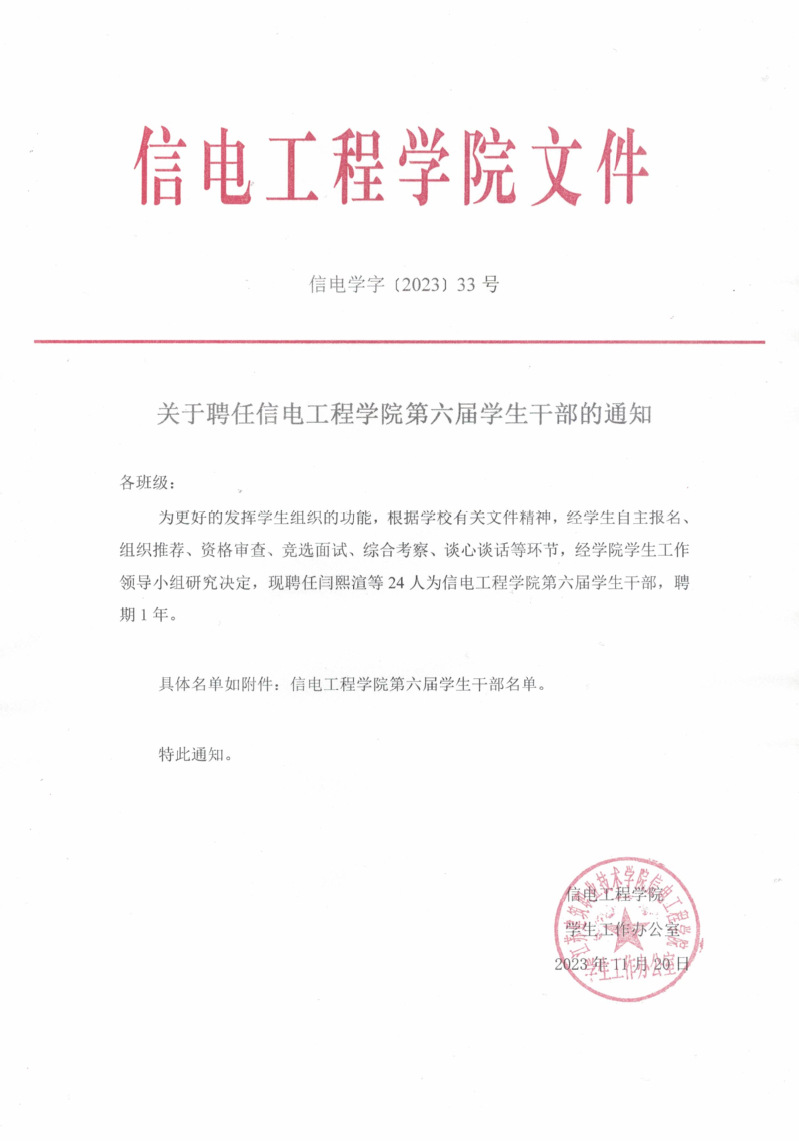 关于聘任信电工程学院第六届学生干部的通知